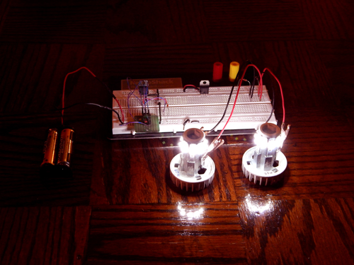 A 20-watt super bright LED array running on 3 volts using 2 AA batteries, |