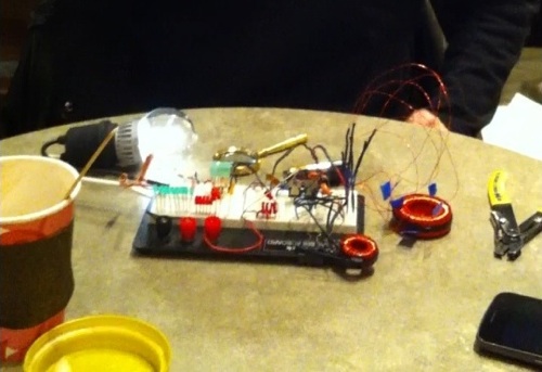 Multiple LEDs running on a AA battery, 300 turn toroid. |